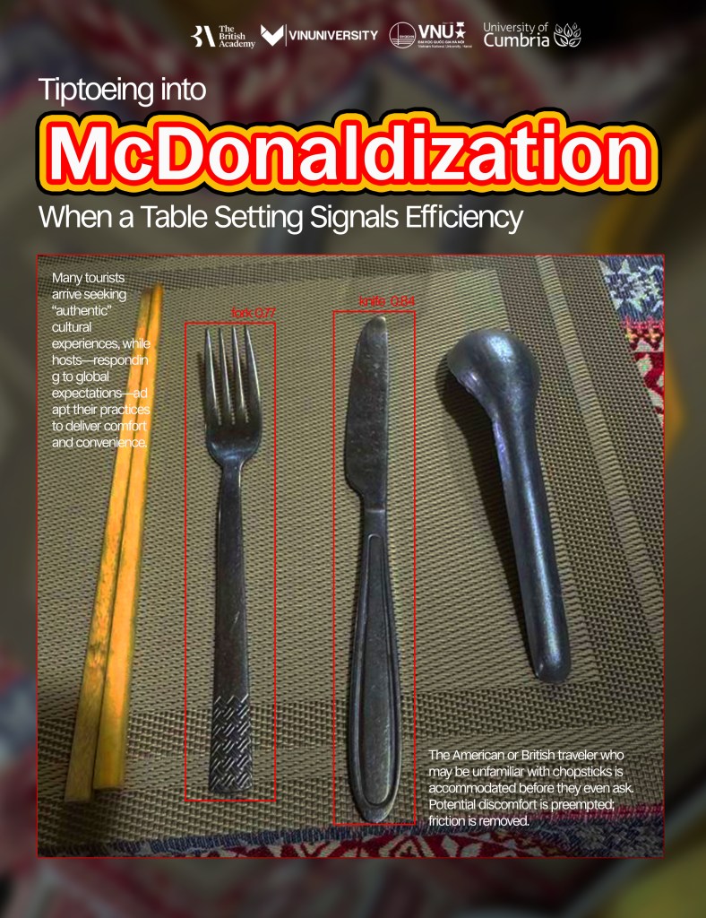 Việc chuẩn bị sẵn nhiều loại dụng cụ ăn uống cho thấy chủ nhà đang chủ động đoán trước nhu cầu của khách quốc tế. Những du khách Mỹ hay Anh, có thể không quen dùng đũa, sẽ được “đáp ứng” ngay từ đầu mà không cần phải yêu cầu. Sự lúng túng được giảm thiểu, mọi trở ngại được làm mượt đi. Theo nghĩa đó, chiếc bàn ăn trở thành một công cụ tối ưu hóa dịch vụ, một biểu hiện của “McDonald hóa” ở cấp độ rất nhỏ.