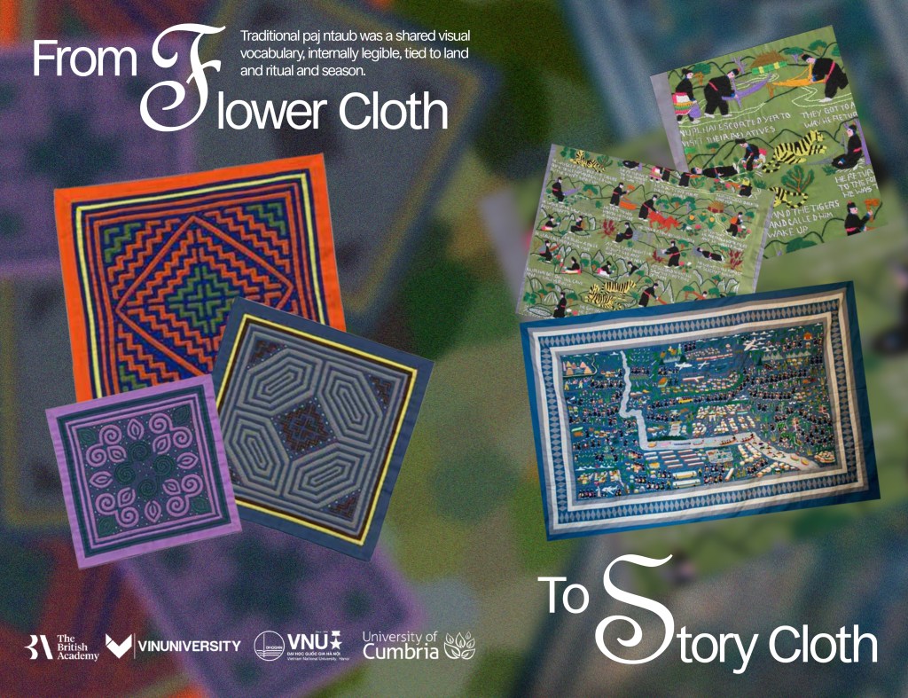 Suốt nhiều thế kỷ, văn hóa Hmoob được lưu giữ giữa những lớp vải. Những họa tiết truyền thống của paj ntaub (hay “vải hoa”) mang tính chức năng hơn là trang trí. Địu em bé và mũ làm từ flower cloth có thể “ngụy trang trẻ em thành những bông hoa để tà ma không thể hái chúng khỏi mặt đất” (Craig, 2010, tr. 2). Những hoa văn này mang tính hình học, trừu tượng, giàu biểu tượng và chỉ được cộng đồng Hmoob hiểu.
